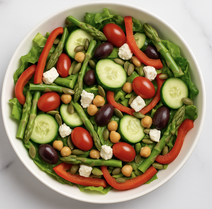 A vibrant and hearty blend of traditional Greek flavors and seasonal produce. Classic ingredients in a Greek salad are paired with crisp asparagus, chickpeas and red peppers for a delightful mix of textures. Topped with toasted pumpkin seeds…